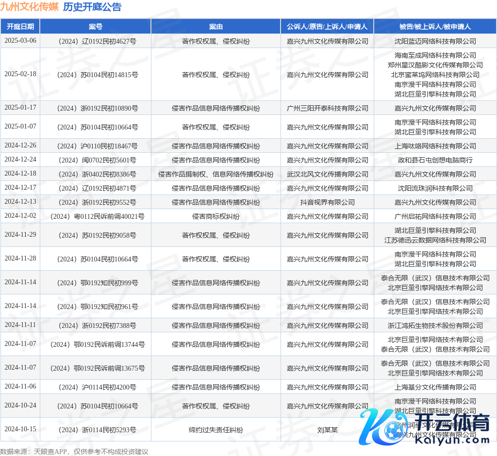 本站音问,把柄天眼查APP裸露,近日公布了一则嘉兴九有文化传媒有限公司四肢原告/上诉东谈主的开庭公告云开体育,详备实质如下: